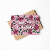 A cute ‘Birthday Loveliness’ message is written in white hand-crafted lettering, surrounded by beautifully illustrated green vines and leaves, large pink flowers and tiny yellow flowers. The whole birthday card design sits on a gorgeous dusty pink background.