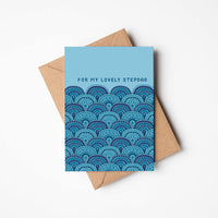 This Father's Day card features an abstract patterned illustration of the sea in shades of blue, alongside a ‘For My Lovely Step Dad’ message written in dark blue hand-crafted lettering.